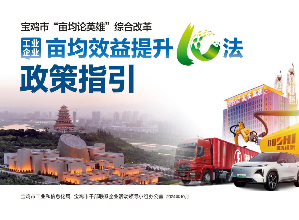 在10月21日宝鸡市工业领域大规模设备更新供需对接会上,宝鸡市工信局发布了《宝鸡市“亩均论英雄”综合改革工业企业亩均效益提升十法政策指引》,鼓励和引导企业通过“更新改造、产品升级、产业转型、科技研发、智改数转、绿色发展、产销对接、集聚入园、整合重组、腾笼换鸟”等10种方法,加快发展方式转型升级,提升发展质量和效益,推动全市工业经济高质量发展。