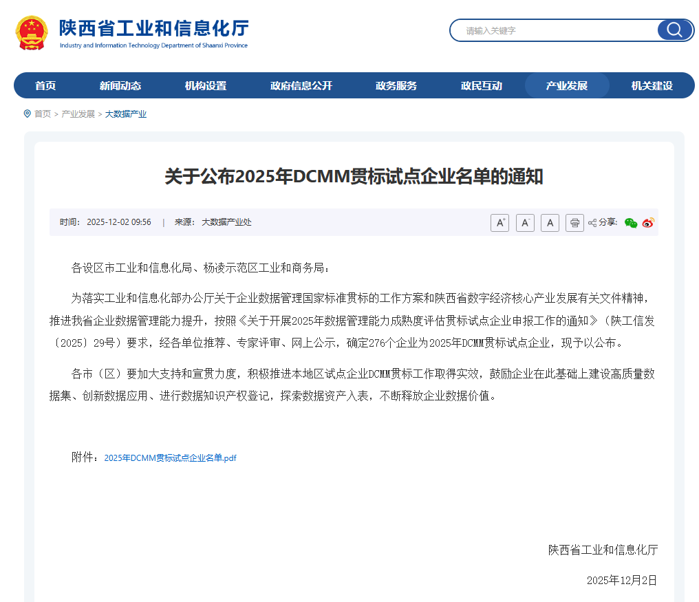 近日,陕西省工业和信息化厅公布了2025年数据管理能力成熟度评估(DCMM)贯标试点企业名单。我区陕西宝化科技有限责任公司、陕西恒诚制药有限公司、陕西海普西凤包装有限公司、陕西博雅服饰科技有限公司、陕西裕隆气体有限公司5户企业成功入选,标志着我区在推动企业数据管理体系建设、提升数据治理能力方面取得了重要进展。